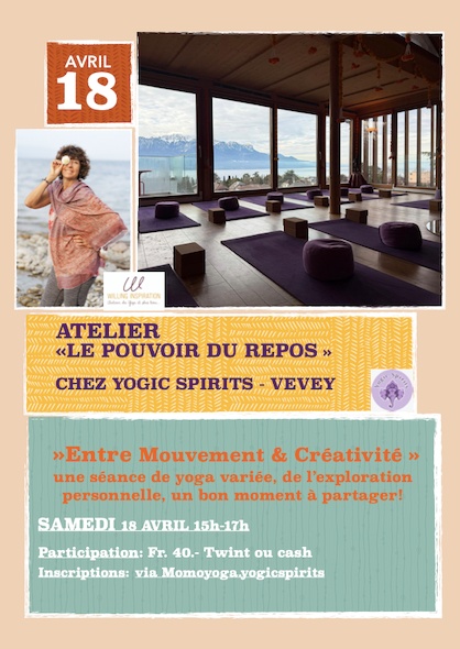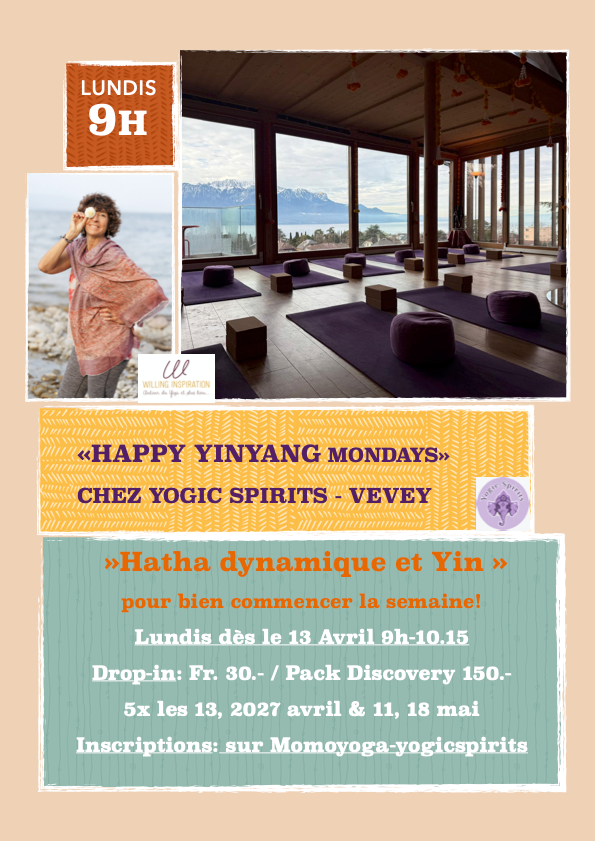 - Séances hebdomadaires de Hatha et Yin Yoga en groupe sur Vevey, à la belle salle du Premier Etage, sur les Ateliers.